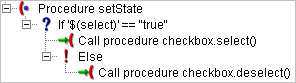 Figure 6.5 - Déclaration de Condition pour le nSud If Rappelez-vous que se référer à une variable implique l'utilisation de la syntaxe "$(variable)". Les guillemets simples et doubles dans la condition sont la manière de qftestJUI d'évaluer les chaînes. Une syntaxe différente est requise pour différents types de conditions comme des expressions mathématiques. Référez-vous aux sections Variables et If control node dans le Manuel Utilisateur. Si la condition évalue à true, alors les nSuds sous le nSud If sont exécutés. Vous pouvez maintenant insérer la logique qui fera que la case à cocher sera sélectionnée. Mais comment faire? Il y a plusieurs manières : vous pouvez, par exemple, copier les nSuds depuis le procédure select à cette partie de setState. Toutefois, nous opterons pour la solution la plus facile en faisant un appel à la procédure checkbox.select, ici : (Cf. section 5.8 du chapitre 5). Maintenant nous en venons à la partie Else de la construction. Après le dernier nSud dans notre bloc if (vous en avez seulement un, mais vous pourriez en avoir plus), vous pouvez insérer le nSud Else en utilisant le menu Insert -> Control structures -> Else. Vous n'êtes pas obligé(e) de remplir les informations dans la fenêtre de dialogue de propriétés qui s'affiche pour le nSud Else. C'est automatiquement supposé être l'antithèse logique du nSud If correspondant. Enfin, nous finalisons la construction par l'ajout du/des nSud(s) devant être exécuté(s) quand la condition du nSud If n'est pas vraie. Donc ici nous insérons un appel à la procédure checkbox.deselect. La procédure setState est maintenant finalisée ! Voici à quoi elle doit ressembler :