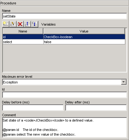 Figure 6.8 - Appel de Procédure à setState Remarque : Parfois vous pouvez vouloir créer une procédure qui retourne une valeur, c'est-à-dire une procédure getState. A cette fin un nSud de retour peut être utilisé dans la procédure. La valeur retournée peut alors être attribuée à une variable globale ou locale en dehors de la procédure, utilisant l'attribut Variable for return value du nSud Procedure call visible dans la figure ci-dessous. Pour plus d'informations, merci de vous référer au Manuel de Référence. 6.9 Documentation de la Procédure Maintenant que vous avez finalisé l'implémentation de votre procédure avec succès, nous allons vous montrer une manière commode pour créer la documentation. Pour le langage de programmation Java, il existe une manière standard pour documenter le code source - cela s'appelle javadoc. Cet utilitaire sait analyser votre code source Java et en extraire des informations pour générer une documentation, assez riche et conviviale, au format HTML. Outre les informations purement liées au code Java, javadoc sait récupérer des commentaires que vous vous devez d'adjoindre à votre code. qftestJUI offre un mécanisme similaire pour documenter vos paquetages et vos procédures. Dans la suite de ce document, nous vous montrerons comment cela est fait. Si vous voulez jeter un premier coup d'Sil sur le résultat produit, veuillez regarder le fichier qfs.html. Maintenant, nous allons commencé à documenter notre procédure. Merci d'ouvrir le nSud procédure setState, s'il n'est pas déjà ouvert. Comme vous pouvez le voir dans la figure ci-dessous, la procédure a deux paramètres. Pour les documenter, nous ajoutons deux lignes dans le champ Comment du nSud, commençant par @param suivi du nom du paramètre et une description appropriée. @param est une balise spéciale pour indiquer la relation de la description aux paramètres de procédure. Une description générale de la procédure peut être ajoutée au début du champ Comment. Remarquez que c'est possible d'utiliser des balises HTML pour formater le texte :