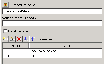 Figure 6.3 - Paquetage Checkbox avec deux Procédures Dans le chapitre précédent (Cf. section 5.8), vous avez créé un appel à la procédure selectCheckbox. Maintenant, il vous faut changer cet appel pour qu'il ait un nom correct. Les appels aux procédures dans des paquetages suivent une règle de syntaxe qui référence la hiérarchie entière de la procédure d'une manière élégante : package.procedure - ainsi, votre appel de procédure sera maintenant à la procédure nommée checkbox.select. Conseil : Les paquetages peuvent, selon notre définition, contenir non seulement des procédures, mais également d'autres paquetages. Si une procédure est située dans une telle structure de paquetage emboîtée, alors la même règle pour appeler la procédure s'applique comme ci-dessus, avec autant d'états paquetage. devant le nom de la procédure que nécessaire. Par exemple, votre appel de procédure pourrait être quelque chose comme menu.file.open, qui implique deux paquetages (menu et file) avec la procédure nommée open. Essayez de créer un autre appel de procédure maintenant à la procédure checkbox.deselect. Vous devez désormais savoir comment procéder en utilisant les techniques décrites dans ce didacticiel. 6.5 Création d'une Procédure Polyvalente Les deux procédures que vous avez maintenant dans le paquetage checkbox vous permettront de sélectionner ou de ne pas sélectionner séparément une case à cocher. Comment serait-elle si nous avions créé une procédure simple qui combine les deux fonctions ? Dans cette section et les suivantes, vous allez créer une procédure appelée setState qui positionnera l'état d'une case à cocher à "sélectionné" ou "non sélectionné". Cette nouvelle procédure inclura une variable que nous appellerons select, qui si elle est positionnée à true fera que la procédure sélectionnera la case à cocher, autrement (select est false), la case à cocher ne sera pas sélectionnée. Commençons par créer la nouvelle procédure setState dans le paquetage checkbox. Si vous avez besoin d'aide pour créer une nouvelle procédure, merci de bien vouloir vous référer à la section 5.2 du chapitre 5. Comme nous venons de l'indiquer, votre nouvelle procédure contiendra la variable select qui sera utilisée pour décider quoi faire avec la case à cocher. Comme avec l'ID du composant que vous avez passé à la procédure dans votre appel de procédure, une valeur select (soit true, soit false) doit également être passée comme argument à setState. Il est cependant habituel pour les procédures qui se servent d'une telle variable de définir un paramétrage par défaut pour la variable. Cela signifie que passer une valeur select à la procédure comme argument est facultatif. Quand aucune valeur n'est passée, la variable prend la valeur par défaut. Cliquez sur le nSud procédure setState pour visualiser ses propriétés dans la fenêtre de détails. Vous remarquerez qu'une zone pour définir des variables est incluse dans les propriétés. En fait, des variables pour une procédure sont ajoutées, éditées et supprimées de la même manière que ce que vous avez vu en section 5.8 du chapitre 5). De la même manière, ajoutez maintenant la variable select et donnez-lui pour valeur true. Voici à quoi les propriétés de votre procédure doivent ressembler :
