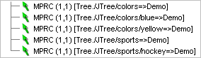 Figure 9.15 - Clics Souris Enregistrés avec le JTree Tout d'abord, essayez d'ajuster et de jouer votre séquence enregistrée pour comprendre comment les arbres sont gérés. Par exemple, en retirant les clics intermédiaires qui ont ouvert le nSud JTree, alors les nSuds colors ne sont pas nécessaires si vous voulez simplement cliquer sur le nSud yellow. Dans ce cas, QF-Test ouvrira automatiquement l'arbre. Maintenant regardons la syntaxe, par exemple pour le clic sur le nSud /JTree/colors/yellow. L'opérateur de chemin ('/') est mis en utilisation en décrivant le chemin pris par l'arbre pour trouver le bon nSud. Ce type de schéma présente de grands avantages dont celui d'éliminer immédiatement le problème d'unicité d'un autre nSud avec le même nSud situé dans une branche différente de l'arbre. Le seul problème d'unicité qui demeure est s'il y a des nSuds arbre du même nom situés dans la même branche (c'est-à-dire, il y a deux nSuds yellow situés dans /JTree/colors). Dans ce cas, nous pouvons revenir à notre mécanisme de référencement numérique d'un nSud. La modification de l'indexation d'un nSud JTree est la mieux réalisée en utilisant la méthode d'accès direct introduite dans la section précédente. Ici, nous utilisons l'un des opérateurs @, &, ou % pour permettre respectivement des références directes textuelles, numériques ou expression régulière. Voici à quoi ressemble une référence numérique au même nSud en utilisant l'accès direct :