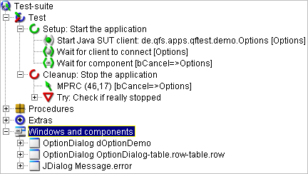 Dans ce chapitre, nous allons approfondir les concepts étudiés dans les précédents chapitres. Notre objectif est de vous montrer comment vous pouvez modulariser les suites de test. Dans la mesure où les caractéristiques que nous allons présenter ici sont plus avancées que celles étudiées précédemment, il est important que vous ayez bien compris les concepts étudiés précédemment. Alors que vous commencez à développer des suites de test spécifiques à vos besoins, vous vous trouverez souvent dans des situations dans lesquelles vous effectuez les mêmes étapes à plusieurs reprises, ou de façon redondante. La suite A, par exemple, peut souvent nécessiter l'utilisation d'opération de menu dans votre SUT dont la suite B a également besoin. Au lieu d'avoir la même procédure dans chacune des suites, il est beaucoup plus utile et fiable, d'avoir un source commun pour la procédure. Cela nous amène à introduire le concept de la suite d'utilitaire (ou de bibliothèque) qui contient des procédures communes pour l'utilisation par n'importe quel nombre d'autres suites de test. Votre utils.qft, que vous avez sauvegardé dans la section précédente (Cf. section 6.10 du chapitre 6), va donc servir comme une sorte de bibliothèque à laquelle les autres suites de test peuvent accéder pour les procédures d'utilitaires communes. L'avantage d'une telle structure est que vous avez une bibliothèque de routines stables qui peut être utilisée pour effectuer leur fonction précisément par d'autres suites de test. Une telle modularisation de suites est facile à mettre en oeuvre dans QF-Test. 7.1 Création de la Suite Pilote Ouvrez maintenant une nouvelle suite avec le menu File -> New Suite. Avec cette suite de test, vous allez créer un test réel pour le SUT. Vous devez également ramener votre suite de test utils.qft, qui contient le paquetage checkbox que vous avez écrit dans le chapitre précédent. Sauvegardez la nouvelle suite pilote dans le même répertoire que utils.qft. C'est nécessaire, ainsi vous pouvez utiliser des noms de chemin d'accès relatifs quand une suite de test se réfère à une autre. Le nom du fichier n'a pas d'incidence. 7.2 Appartenance de la Suite d'Utilitaires Si l'application SUT n'est pas déjà en exécution, démarrez-la. Vous remarquerez que les nSuds de démarrage pour le SUT sont encore situés dans utils.qft. Une vraie suite d'utilitaires ne devrait avoir aucune connexion directe à un SUT, tout simplement parce que la suite d'utilitaires peut être utilisée par d'autres suites de test qui testent différents SUT. Par exemple, disons que vous avez deux SUT complètement différents, A et B, que vous devez tester. Aussi vous voudriez créer deux suites de test pour chaque SUT. Mais, dans chacune des applications SUT, des cases à cocher sont présentes, qui peuvent être sélectionnées ou pas en utilisant votre suite d'utilitaires utils.qft. utils.qft doit donc être suffisamment polyvalente pour gérer ce genre de situation. utils.qft contient des éléments qui les lient directement au SUT Options Demo, que nous avons créé en section 5.1, c'est-à-dire les nSuds Setup/Cleanup tout comme la section Windows and components. Cette information spécifique au SUT est maintenant sans rapport avec la suite d'utilitaires et doit être déplacée dans la suite de test qui testera directement le SUT. Aussi, de la même manière qu'en section 5.1 du chapitre 5, vous pouvez maintenant déplacer les nSuds Setup/Cleanup et le contenu du nSud Windows and components dans votre nouvelle suite. Utilisez bien le menu Couper, et non pas Copier, pour que les nSuds soient bien enlevés de utils.qft. Une fois effectuée, votre nouvelle suite de test doit ressembler au squelette que nous avons vu sur la figure 5.1. Vous pouvez aussi nettoyer les nSuds de l'appel de procédure que vous avez créés dans utils.qft. ![]() Figure 7.1 - Suite Utilitaire utils.qft 7.3 Création d'une Séquence de Test Dans cette section, vous utiliserez votre nouvelle suite de test pour créer une séquence de test pour le SUT. La séquence de test sera simple : sélectionnez la fenêtre Miscellaneous du SUT et décochez la case Boolean option. Après le nSud Setup dans votre suite de test, insérez un nSud séquence avec le menu Insert -> Sequence nodes -> Sequence. Donnez-lui un nom tel que Deselect checkbox. Ouvrez le nSud pour pouvoir y insérer de nouveaux nSuds. ![]() Figure 7.2 - Désélection du NSud Séquence Checkbox Maintenant cliquez sur le bouton d'enregistrement Dans la séquence enregistrée qui apparaît dans le nSud Extras, vous voyez seulement un événement enregistré, à savoir le clic de l'élément Miscellaneous. Déplacez ce nSud dans votre nouveau nSud séquence, ce qui devrait vous donner ceci : Figure 7.3 - NSud Séquence avec le Clic Enregistré 7.4 Appel d'une Procédure dans la Suite Utilitaire L'étape suivante dans la séquence du test consiste à faire un appel à la suite utilitaire pour désélectionner la case à cocher. Comme vous l'avez fait en section 6.8 du chapitre 6, insérez un nSud appel de procédure à la procédure checkbox.setState. Cette fois, toutefois, nous avons besoin de procéder à une légère modification, dans la mesure où la procédure est dans une autre suite de test. Les appels de procédure dans QF-Test peuvent être précédés du nom de la suite (suite#procedure) pour indiquer que la procédure cible est située dans la suite de test fournie. Pour notre exemple, l'appel de procédure est correctement déclaré utils.qft#checkbox.setState. N'oubliez pas de renseigner les variables comme cela a été fait en section 6.8 du chapitre 6, avec select positionné à false. ![]() Figure 7.4 - Appel de Procédure à Utils.qft Au lieu de faire des appels de procédure qui incluent une référence explicite à la suite de test comme avec utils.qft#setState, QF-Test fournit un mécanisme simple qui vous permet d'inclure certai