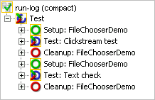 Figure 3.6 - Séquence Setup de FileChooserDemo L'étape suivante consiste à créer le nSud Sequence pour notre flux de saisie (clickstream). Vous devez fermer les branches du nSud Setup pour que le marqueur d'insertion soit placé après Setup, et non dedans. Alors vous pouvez déplacer votre séquence enregistrée du nSud Extras vers le marqueur d'insertion pour que le nSud Sequence apparaisse directement après la séquence Setup. En dernier lieu vous pouvez créer une séquence Cleanup pour arrêter l'application. Cette séquence contient deux nSuds : un pour arrêter le client, et un autre pour s'assurer qu'il est bien terminé. Sur la figure ci-dessous, vous pouvez voir quels nSuds sont nécessairement mis en exécution pour cet exercice. Votre suite de test doit ressembler à ce qui suit :