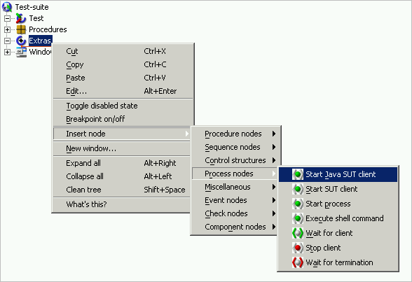 3.2 Démarrage de l'Application Ouvrez une nouvelle (vide) suite de test dans QF-Test avec le menu File -> New Suite. Sachez que l'"ancienne" suite de test reste ouverte dans une fenêtre différente. Si vous venez juste de démarrer QF-Test (en cliquant sur l'icône du bureau ou en entrant QF-Test depuis une ligne de commande), vous verrez que vous avez déjà une suite de test vide sous vos yeux. Assurez-vous que la vue détaillée est activée (menu View -> Show Details). Vous voyez maintenant la fenêtre divisée en deux avec un arbre du côté gauche et un volet du côté droit, représentant les détails du nSud sélectionné. L'arbre vous permet de naviguer parmi les nSuds de la suite de test ; lorsque vous sélectionnez un nSud, ses propriétés s'affichent sur le volet de droite. Pour commencer vous devez démarrer votre application. Comme mentionné précédemment, l'application à tester est FileChooserDemo du kit de développement logiciel Java. Pour cet exemple, nous commençons par insérer des éléments dans le nSud Extras de la suite de test. Cette zone est une sorte de bloc-notes dans laquelle nous pouvons expérimenter certains concepts avant de les placer dans la structure correcte de la suite de test. Quand vous ouvrez la branche du nSud Extras, vous voyez apparaître une fine ligne rouge juste après. Nous nous y référons comme un "marqueur d'insertion". Le but étant de vous faire savoir où le prochain nSud sera inséré si vous sélectionnez un élément depuis le menu Insert. Remarque : Avant que vous n'insériez réellement le nSud pour démarrer le SUT, voici quelques explications sur le comportement de QF-Test lors de l'insertion de nSuds à la position du marqueur d'insertion. En fait, QF-Test vous laisse uniquement choisir des nSuds qui sont "autorisés" à être insérés à la position courante du marqueur. Aussi si par exemple vous sélectionnez le nSud racine de votre suite de test (en laissant la branche du nSud ouverte) et vous essayez d'insérer un nSud via le menu Insert, tous les choix sont désactivés mais seul le nSud Test de Sequences nodes est sélectionnable. Il y a d'autres restrictions avec d'autres types de nSuds (merci de vous référer au Manuel Utilisateur). Parfois vous serez surpris de voir qu'un nSud attendu ne peut pas être inséré, mais dans la plupart des cas cela est dû à une mauvaise position du marqueur d'insertion, parce que vous n'avez pas ouvert la branche du nSud parent pour insérer le nouveau nSud comme fils. Remarque sur la version 2.0 : Un nouvel Assistant de Démarrage rapide est disponible dans QF-Test 2.0 pour simplifier le processus de création d'une séquence de démarrage de l'application. Vous pouvez ouvrir l'Assistant via le menu Extras -> Quickstart Wizard... et simplement suivre les étapes. Le remplissage manuel des attributs d'un noeud Start comme décrit dans les paragraphes suivants est toujours valide. Pour démarrer l'application, utilisez le nSud Start Java SUT client. La capture d'écran suivante vous montre comment utiliser les menus contextuels, accessibles par un clic souris droit, pour insérer le nSud.