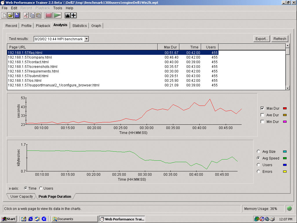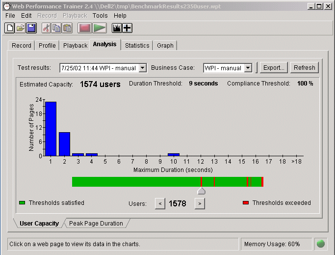 L'onglet Analysis est une nouvelle option de l'outil, qui offre deux nouveaux types d'analyse. La fenêtre User Capacity permet de répondre instantanément à une question stratégique : Combien d'utilisateurs simultanés peuvent accéder à mon application Web ? Trouver ce nombre maximum peut être complexe car de nombreux paramètres doivent être pris en compte : vitesse de la connexion Internet, temps de chargement de chaque page, sécurité, etc. Parce que chaque application est différente, Web Performance Trainer est configurable pour prendre en compte toutes ses spécificités, et produire un rapport d'analyse représentatif de la réalité, et immédiatement compréhensible. L'analyse de la capacité du nombre maximum d'utilisateurs pour une application Web en fonction d'objectifs de performance est présentée sous une forme graphique. Ce rapport peut être exporté.